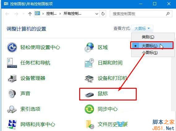 2、在控制面板右上角将查看方式修改为“大图标”,在下面找到并点击【鼠标】按钮;