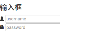 <h3>输入框</h3> <div class="input-group"> <span class="glyphicon glyphicon-user"></span> <input type="text" placeholder="username"> </div> <div class="input-group"> <span class="glyphicon glyphicon-lock"></span> <input type="password" placeholder="password"> </div>
