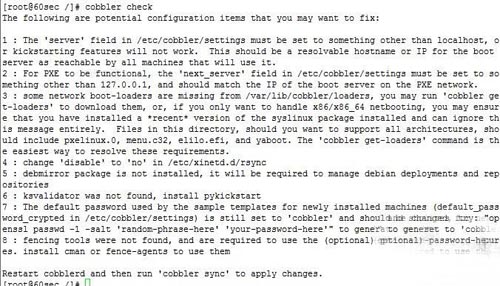 2、执行cobbler check命令检查存的问题,而后逐一按提示解决之