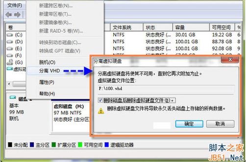2、如果想要彻底删除虚拟磁盘,则可进入“磁盘管理”窗口右击“虚拟磁盘”图标,选择“分离VHD”,在弹出的“分离虚拟硬盘”窗口,单击“确定”按钮,即可彻底删除虚拟磁盘了。