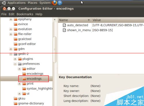 3、点击左边的”+“号找到 /apps/gedit-2/preferences/encodings,并单击