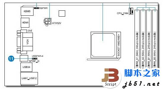主板的SPDIF输出位置图(蓝色11标注处)