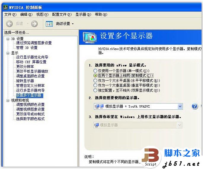 点击windows状态栏上的NVIDIA图标,在弹出菜单里面选择 NVIDIA控制面板(如下图)。在控制面板左边的任务列表里面选择设置多个显示器,在右半部分的1选择要用的 nView 显示模式里,选择 “在两个显示器上相同(复制模式(C)),然后点击右下角的应用按钮。就实现了屏幕复制功能。这样,电视和显示器上的画面就完全一致了,你就可以在电视上操作电脑了。