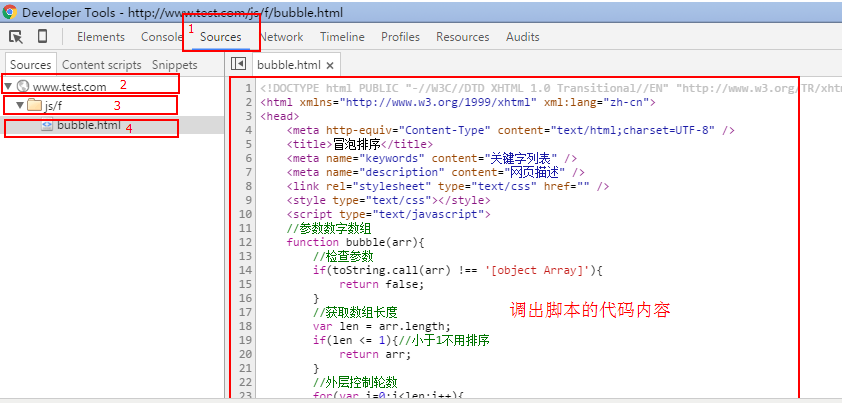 选择好了断点之后,接下来在谷歌浏览器中再次运行脚本,就是对下面的www.test.com/js/f/bubble.html再回车运行