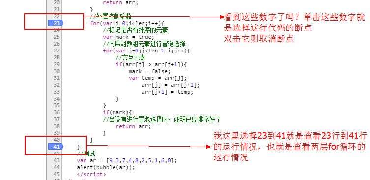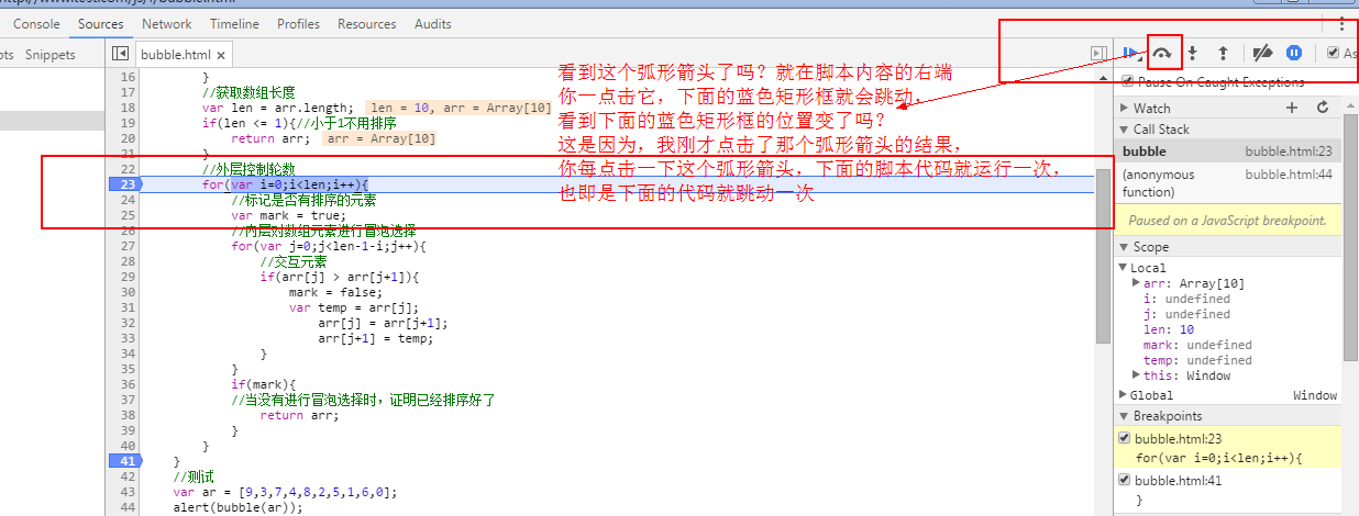 对于这个调试小功能就介绍到这里了,下面进入正题,没办法直接想象出冒泡排序的执行情况的话,你可以按我上面的步骤调出谷歌的调试功能,直观的查看冒泡排序的整个过程。