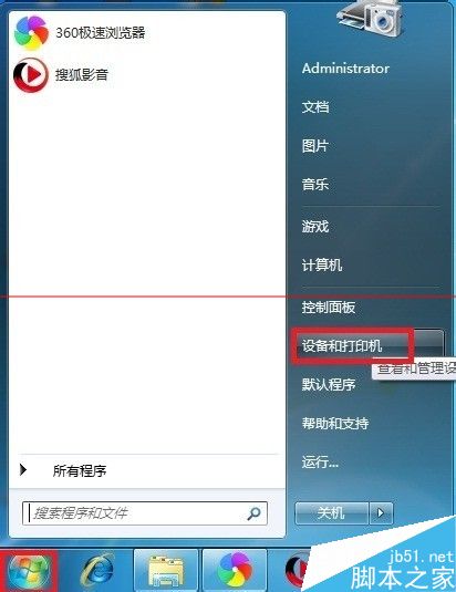 2、单击--开始--选择--设备和打印机