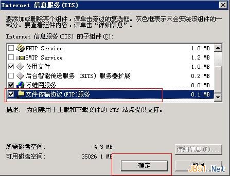 选中图片中的“文件传输协议(ftp)服务”然后点击“确定”