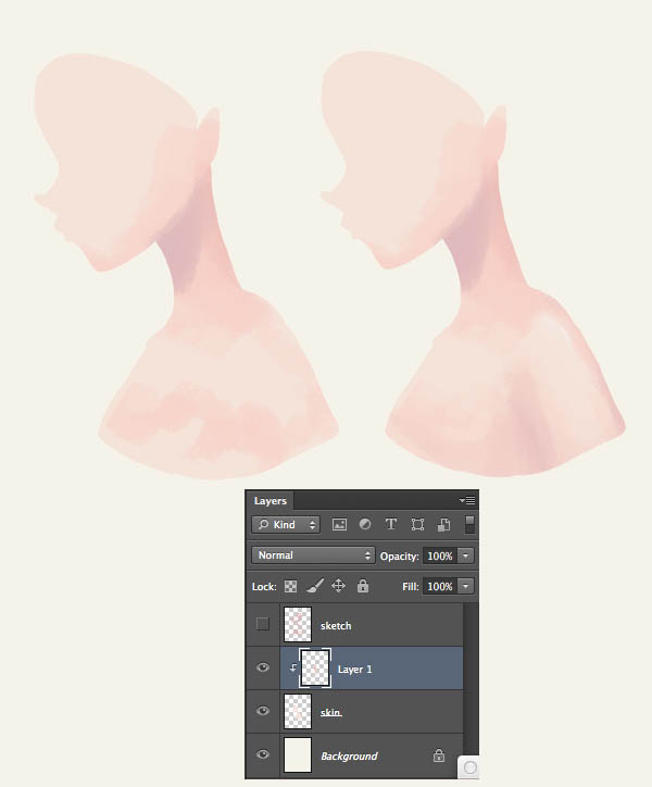 5、现在选择我们的“皮肤(Skin)”图层,按住Alt键并单击图层面板底部的新建新图层图标。勾选下面的复选框:使用前一图层创建剪贴蒙版。然后点击OK按钮。于是你有了一个新的图层,由一个小箭头图标连接着你的“皮肤”图层。现在,你可以在皮肤的轮廓内绘画,而不担心画出面部和身体的边缘。