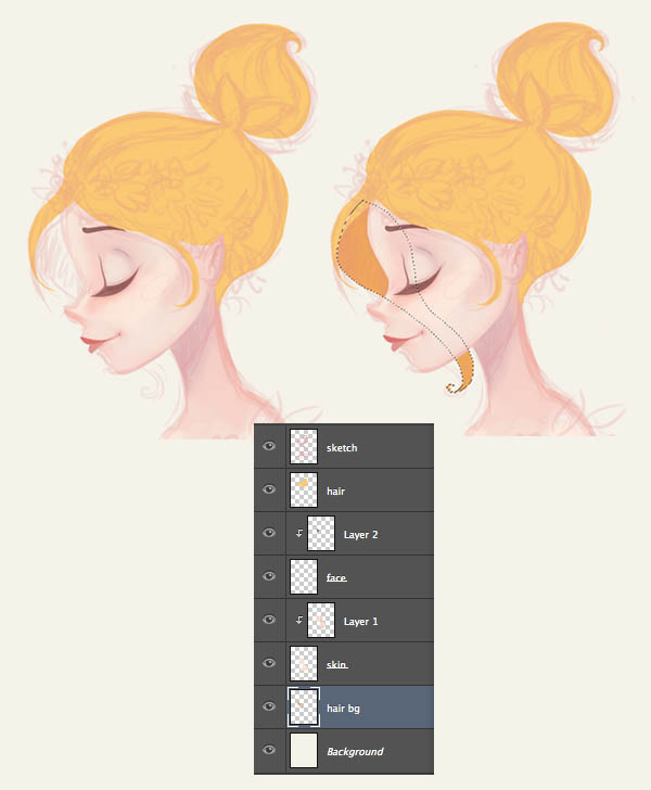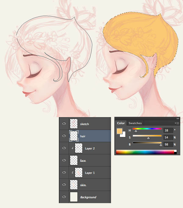 17、创建一个新的头发图层,根据草图用套索工具(L)拉出大致形状,用柔和的黄色填充创建区域,画出一个麦金色的圆发髻。