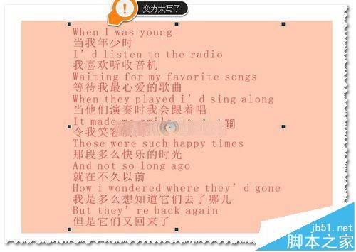 7、这段英文的歌词的“i”也应该是大写的,怎么把这个小写的"i"转换为大写呢?选中小写的"i",然后选择菜单栏——文本——找到更改大小写。(当然你可以新写入大写的。)如图