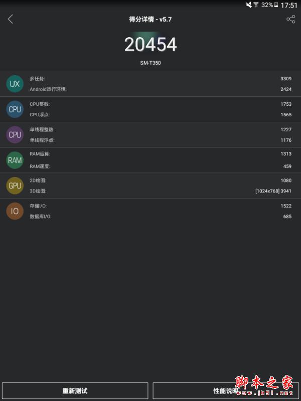在该项测试中,三星Galaxy TAB A 8.0平板电脑最终总得分为20454分,性能十分给力。安兔兔最终给出的评价为,可以运行大型软件,并且可以同时运行多个程序。图形性能方面也给出了非常高的评价,可以运行各种大型游戏,享受飞跃的感觉。