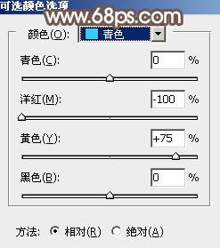 1、打开素材图片,创建可选颜色调整图层,对青色进行调整,参数及效果如下图。这一步把图片中的青色转为绿色。