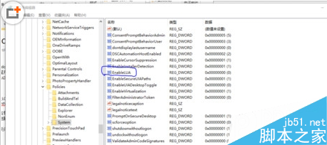 3、找到EnableLUA后双击打开,在EnableLUA属性窗口中将“数值数据”修改为“0”然后点击“确定”,最后关闭注册表,最后重启电脑生效。