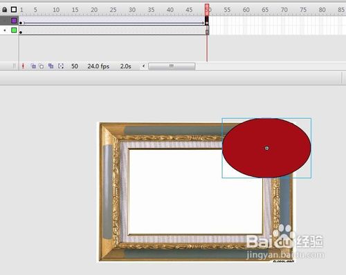 5.在图层2上,选中第50帧,将工作区中的椭圆拖到右边。如下图所示:
