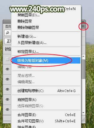 17、然后在图层面板的右上角下来菜单中选择“转换为智能对象”,如下图。
