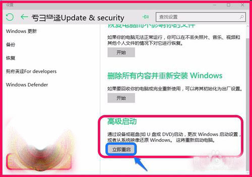 4、在恢复项对应的右侧窗口,我们找到高级启动,并左键点击:立即重启;