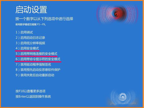 9、点击重启后,计算机重新启动进入启动设置对话窗口,在这个窗口:如果我们要进入一般的安全模式,按键盘上的数字键4;要进入带网络连接的安全模式,按键盘上的数字键5;要进入带命令提示符的安全模式,按键盘上的数字键6;