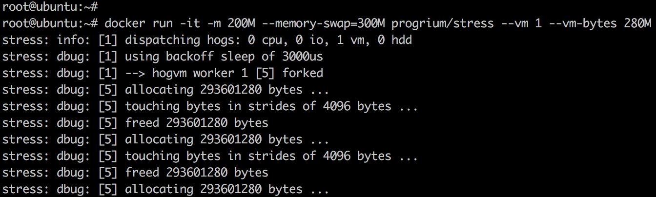 docker run -it -m 200M --memory-swap=300M progrium/stress --vm 1 --vm-bytes 280M
