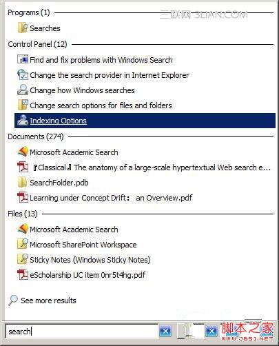 1、Win7下面:搜索栏输入search ===>点击 Indexing Options