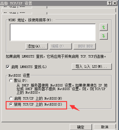 3,打开“TCP/IPV4”属性,高级选项,WINS选项,选择“禁用TCP/IP上的NetBIOS”,然后一路点击“确定”