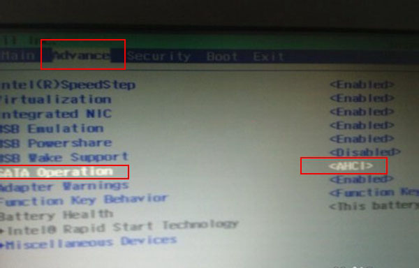 第二步:按ESC返回BIOS操作界面,找到Advance标签,选择“SATA Operation”选项,将硬盘模式切换到AHCI模式,按ESC,选择SAVE保存退出。