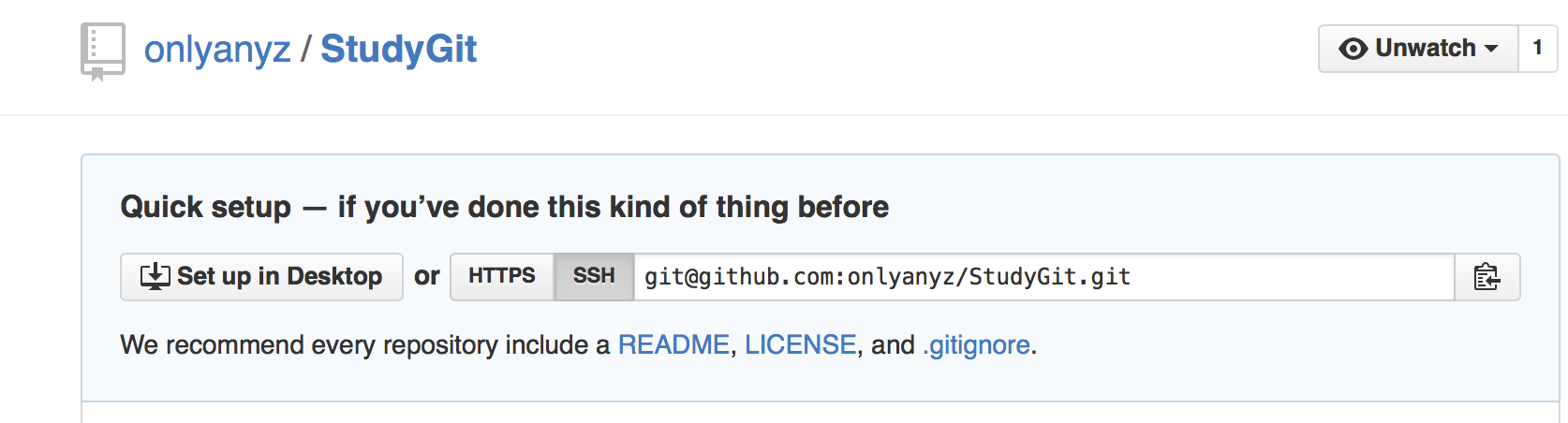 可以看到有一个ssh地址是git@github.com:onlyanyz/StudyGit.git,这个就是我们的远程git仓库地址了,一会我们就会把文件推送到这里。
