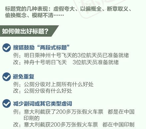 搜狐总编的态度也很简单,标题不要虚假夸大、以偏概全、断章取义、偷换概念、模糊不清,说白了就是不要忽悠人,而其他有创意的有内容的标题就不存在标题党之说。
