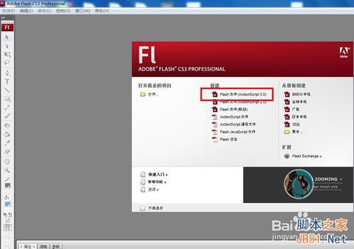 1、启动Flash CS3程序,选择文件新建一个Flash文档。