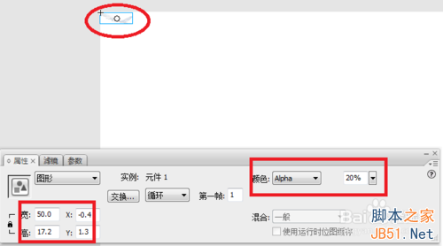 10、选中舞台中的“元件1”,在“属性”面板中设置该元件的宽度为50像素,高度等比例缩放,然后打开“颜色”选择“Alpha”选项,在“Alpha数量”文本框设置透明度为20%,然后将元件拖动舞台的左上角,如图所示。