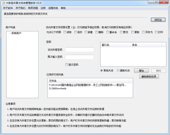 例如,有一款“大势至共享文件夹管理软件”(下载地址:http://www.grablan.com/gxwjjm.html),只需要在服务器上安装之后,就可以设置共享文件的访问权限,可以只允许读取共享文件而禁止复制共享文件、只允许打开共享文件而禁止另存为本地磁盘、只允许修改共享文件而禁止删除共享文件,同时还可以禁止打印共享文件。此外,还可以设置共享文件访问密码,为不同用户设置共享文件的不同访问权限,并支持自主添加访问共享文件的用户,从而极大地保护了共享文件的安全。如下图所示: