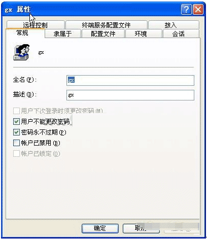 2.在控制面板->管理工具->计算机管理->用户管理->添加一个用户gongxiang,名字随便取,就是以后文件夹加密的用户名,填上密码,然后勾掉“用户下次登录时必须更改密码”,选上“用户不能更改密码”和“密码永不过期”,如下图所示。