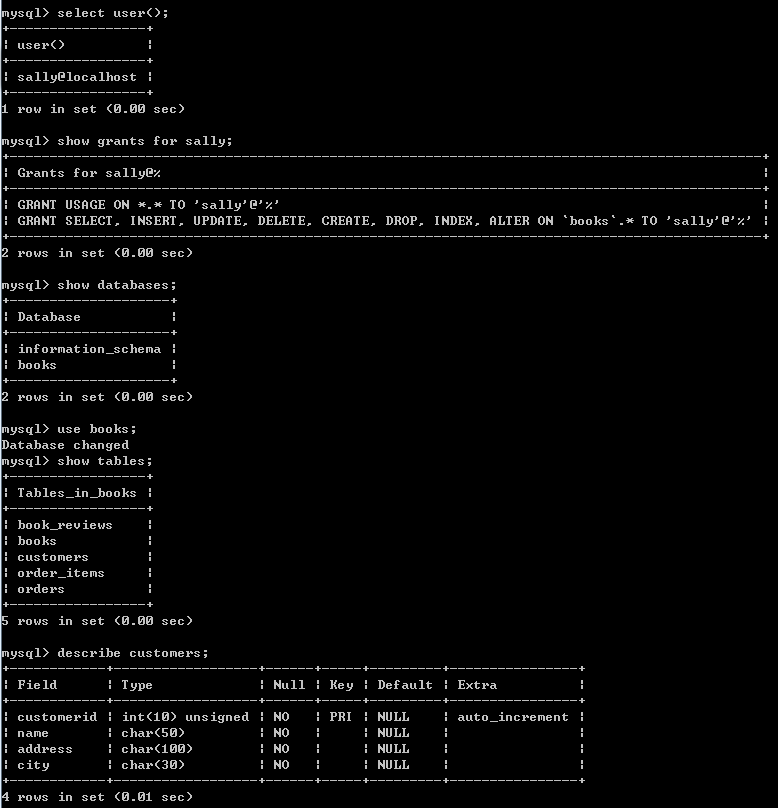 - 查看当前登录数据库用户的权限 show grants for sally; –sally为用户名