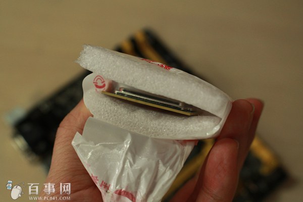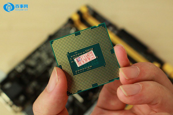 然后取出CPU,在安装处理器之前需要注意,CPU针脚一面要有这样的贴纸,没有可能就是买到二手或者是有问题的产品。这种CPU贴纸是一次性的,很难再次封印,而且撕掉会有明显的痕迹,不好掺假。另外要记得:安装前一定撕掉标签,要不然接触不紧密,无法正常使用,如下图!
