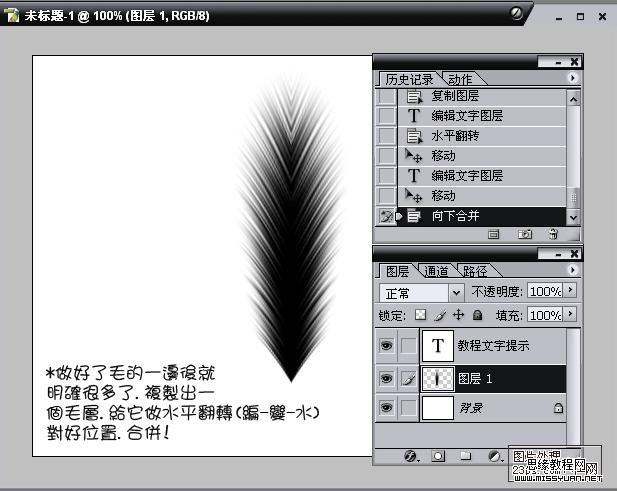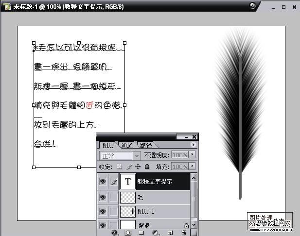 5.新建一层,用矩形绘制一条长条形,然后填充羽毛相近的色彩,放到羽毛的上方,然后把整个完整的羽毛层合并。