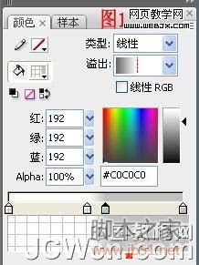 2、添加图层2,在第一帧上再拖张图片2,水平、垂直中齐,右键--转换为影片剪辑,名为“转换1".双击进入编辑区,将图层1延长至125帧(长短可自定),加锁。添加图层2,在图层2第一帧上,选择“矩形工具“,关闭笔触色,关闭“对象绘制”和“紧贴至对象”,颜色码CDCDCD,共四个色块,从左至右的透明度分别是0%、0%、100%、100%,色块位置如图1: