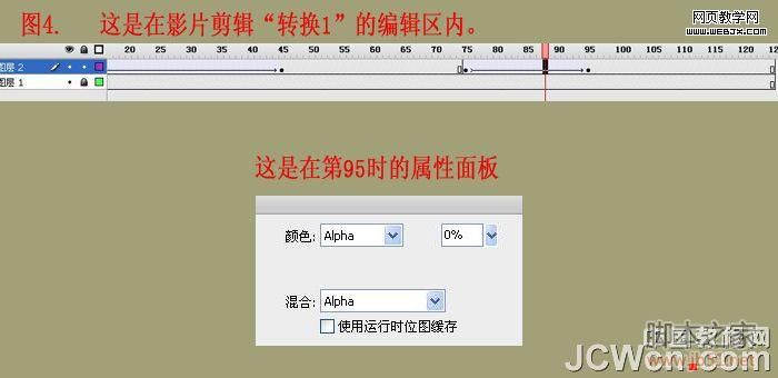 在第45帧处插入关键帧,用左方向键将它向左移至和图片的右边对齐,两帧之间创建动画补间。再回到第一帧上,在属性面板里的“混合”模式里选择“Alpha",第45帧上“混合”模式也是“Alpha”。继续在第75帧上插入关键帧,在第95帧上插入关键帧,将两帧上的图层混合模式都改为“Alpha",选中第95帧,将属性面板里的“颜色”模式定为“Alpha、0%”,两帧之间再创建动画补间。延长至125帧。回场景。如图4: