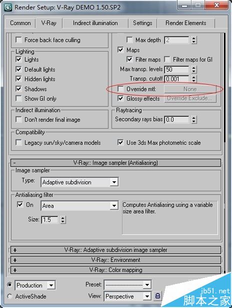 1、在渲染设置栏中打开替代材质开关。