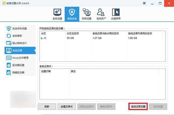 很多用户习惯于关闭系统还原功能,是怕占用过多硬盘空间。在上图中可以看到,系统还原点占据的磁盘空间容量可以根据自己意愿调节,过期、多余的还原点会自动被新还原点替换。当然,你也可以在“设置大师”中手动删除一些你认为没用的还原点