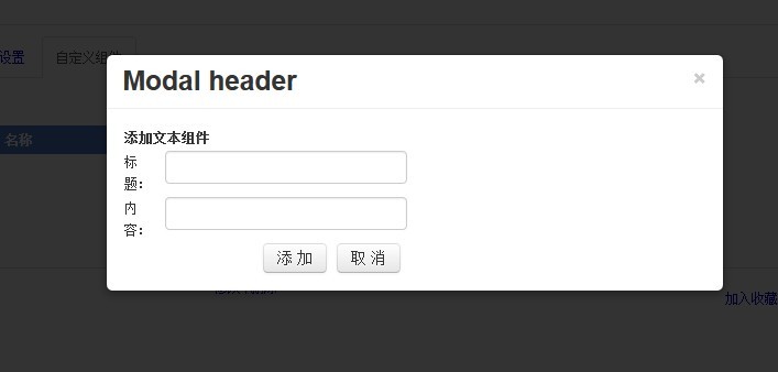 <input id="btntext" type="button" value="添加文本组件" data-toggle="modal" data-target="#myModal" href="../SysManage/ZuJianManage.aspx"/> <!-- Modal --> <div class="modal hide fade" id="myModal" tabindex="-1" role="dialog"> <div class="modal-header"><button class="close" type="button" data-dismiss="modal">×</button> <h3 id="myModalLabel">Modal header</h3> </div> <div class="modal-body"></div> </div>