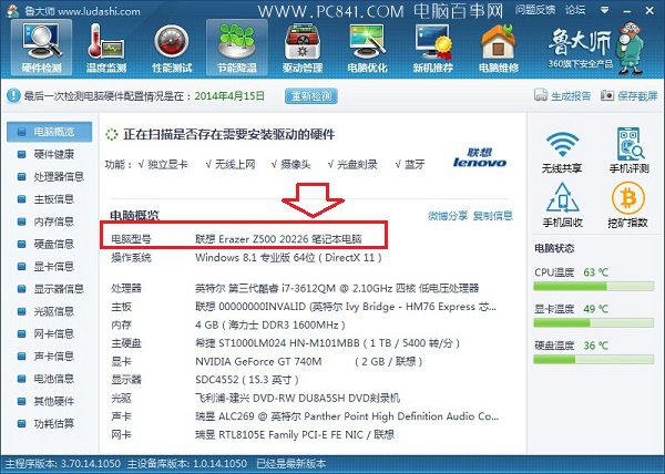 如果在笔记本机身上找不到具体的笔记本电脑型号的话,我们还可以借助一些电脑检测工具,来检测笔记本电脑型号,比如鲁大师、驱动精灵等软件都可以检测到笔记本品牌型号信息,如下图所示: