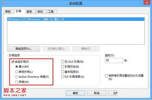 回到系统配置的“引导”窗口,大家可能还发现了“安全引导”的选项,其实这就是Win8的安全模式启动方式。其中“最小”是标准的安全模式,“网络”是允许网络连接的安全模式,而“其他外壳”是带命令提示符的安全模式。