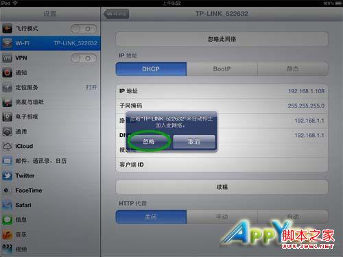 点击iPad3顶部的【忽略此网络】按钮