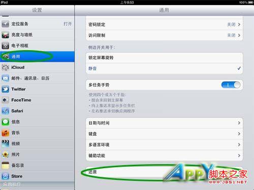 返回到iPad3的【设置】、【通用】,点击最下方的【还原】按钮