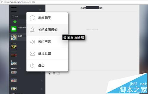 6、如果需要一直开着网页版微信,但是需要阶段性地排除微信消息干扰,可以关掉网页版微信的消息提醒和声音提示。在网页版微信主窗口的汉堡菜单上单击,在弹出的菜单上点击执行“关闭桌面通知”和"关闭声音“即可。