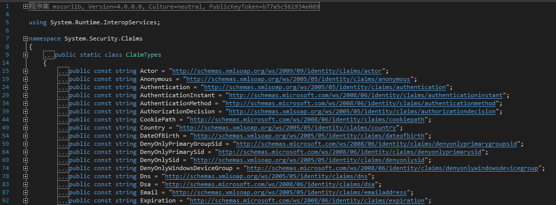 为了阅读体验,截图我只放了一部分哦。可以看到有什么Name,Email,Gender,MobilePhone等常用的都已经有了,其他的还有很多。细心的读者可能注意了,它的命名空间是System.Security.Claims,那就说明这个东西是.net 框架的一部分,嗯,我们暂时只需要知道这么多就OK了。
