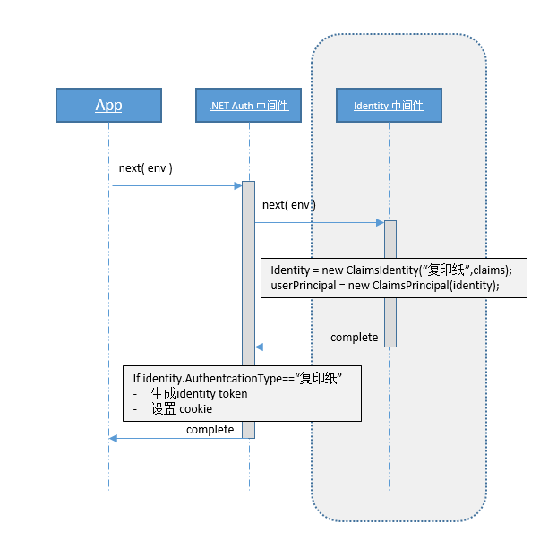 可以看出,首先我们在app这边有一些证件单元,然后调用ClaimsIdentity把证件单元初始化为一个身份证,然后再把身份证交给证件当事人由其保管。