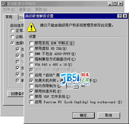单击“开始”菜单,在“运行”的输入框中,键入“msconfig”,按“确定”按钮。这时会启动系统配置实用程序,在常规选项卡里点击“ 高级”按钮,然后选中“如果关机失败,请禁用磁盘扫描程序”前面的选择框,就可以了。