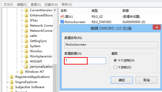 在Personalization项下面,新建一个DWORD (32位)值,名为:NoLockScreen。
