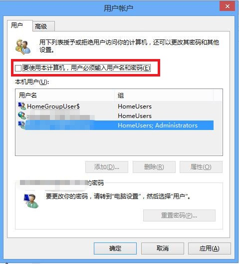 进入Win8账号设置后,首先将“使用本计算机,用户必须输入用户名和密码(E)”前面的“勾”去掉;