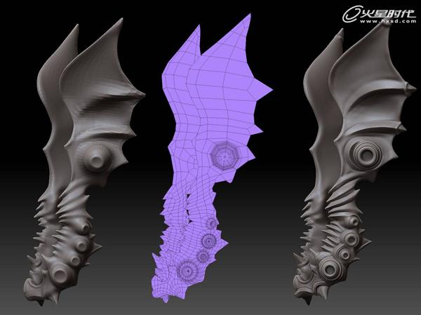 翅膀是单独的对称雕刻,过程也是Z球制作基本形然后雕刻基本结构再拓扑最后雕刻细节。(图16、17)